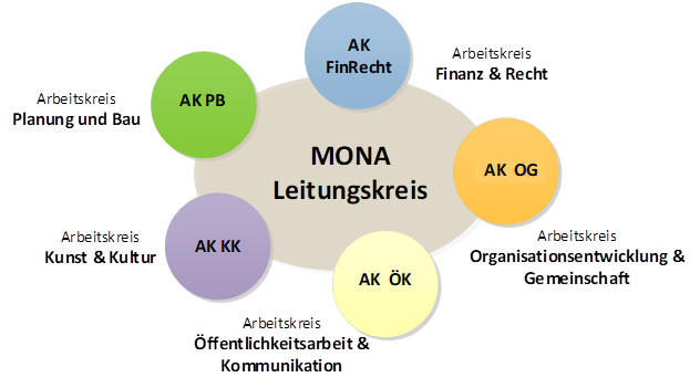 Der LK (Leitungskreis) verbindet alle Arbeitskreise über die doppelte Verknüpfung der „Leitungen“ und „Delegierten“. Er sorgt a) alle zwei Jahre für die offene Wahl der MONA Leitungen, b) für die zentralen Grundsatzentscheidungen in Bezug auf alle MONA Belange.